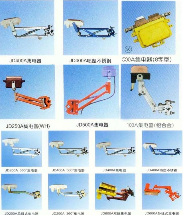 JD系列單級集電器200A 360集電器、500A集電器、500A 360集電器、500A噴塑不銹鋼、1250A集電器、1600A集電器、500A單臂式集電器、2000A集電器、100A集電器、80A C型集電器、68A C型雙桿集電器、800A集電器WH、鋼體滑線雙頭集電器、鋼體滑線單頭集電器、500A集電器8字型。單極滑觸線集電器。